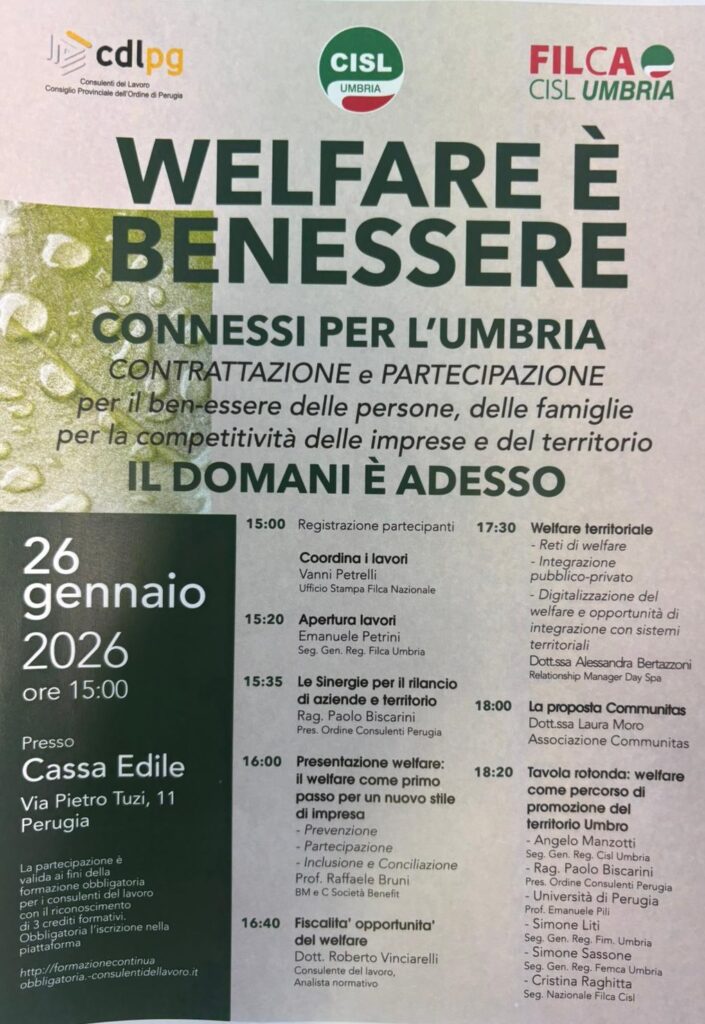 Alle 15.20 aprirà i lavori il segretario generale regionale della Filca Emanuele Petrini. A seguire alle 15.35 Paolo Biscarini, dell’Ordine dei Consulenti del Lavoro di Perugia parlerà sul tema: “Le sinergie per il rilancio di aziende e territorio“; a seguire il professor Raffaele Bruni della BM e C Società Benefit parlerà sul tema: “Il welfare come primo passo per un nuovo stile di impresa“; Roberto Vinciarelli, consulente del lavoro e analista normativo tratterà “Fiscalità e opportunità del welfare”.