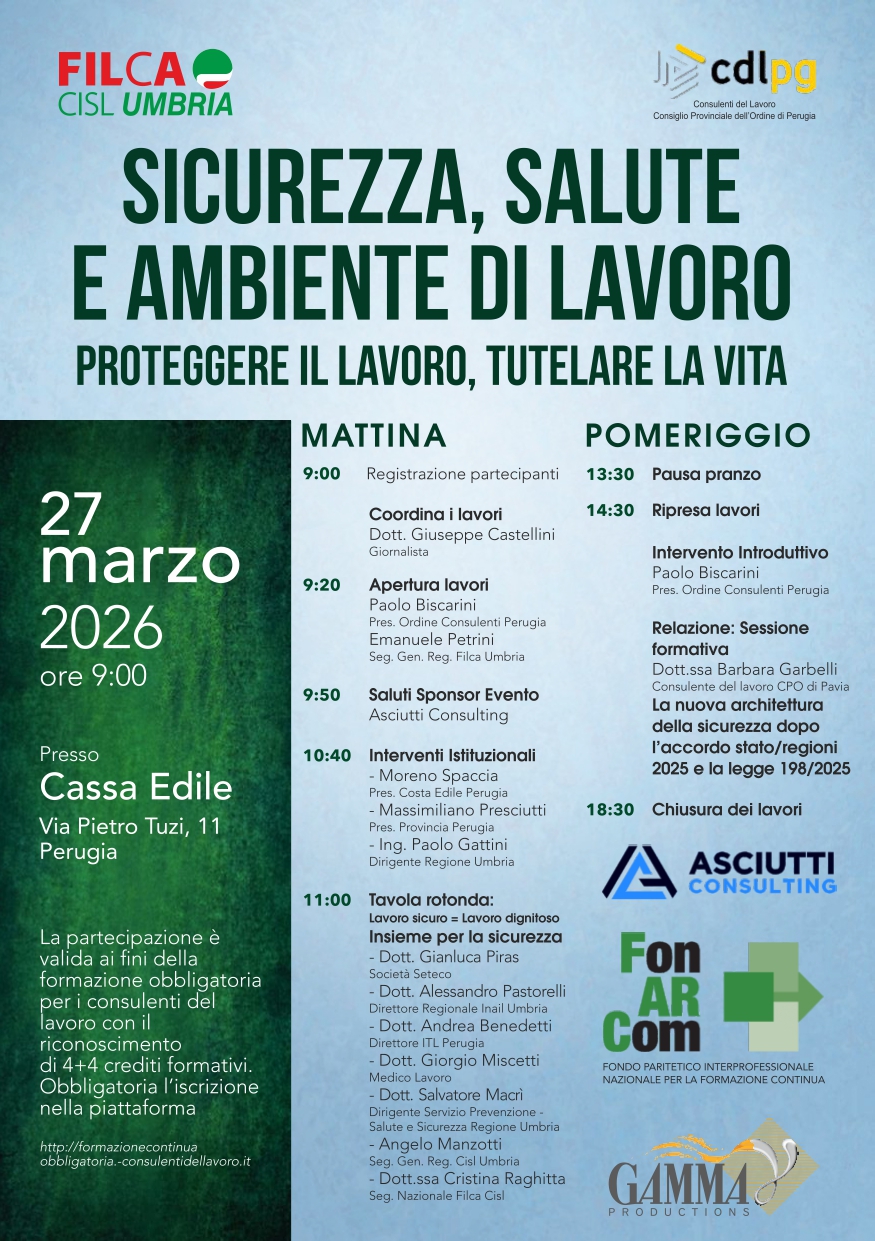 Il prossimo 27 marzo 2026 , la sede della Cassa Edile di Perugia in via Pietro Tuzi 11 ospiterà un convegno intitolato “Sicurezza, Salute e Ambiente di Lavoro”. L’evento, organizzato dalla Filca Cisl Umbria in collaborazione con il Consiglio Provinciale dei Consulenti del Lavoro di Perugia , nasce con l’obiettivo di promuovere il messaggio che proteggere il lavoro significa, prima di tutto, tutelare la vita.